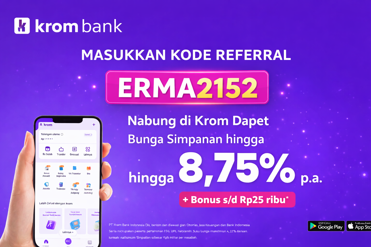 Jika kamu ingin mulai menggunakan layanan bank digital dengan pengalaman lebih optimal, jangan lupa gunakan kode referral Krom Bank Digital 2026 ERMA2152 saat pendaftaran.